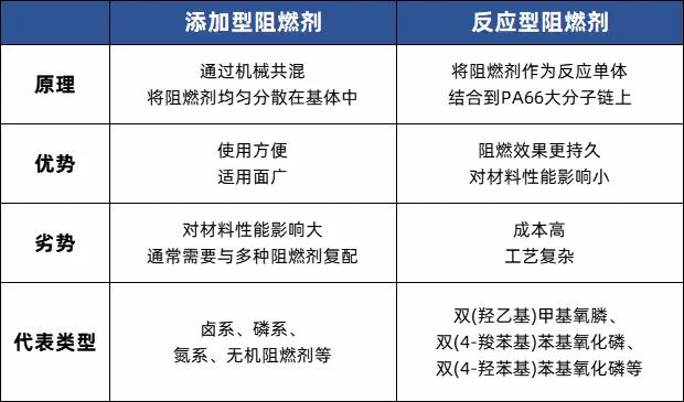 目前,主要改性供应商以及研究人员最主要的PA66阻燃改性手段共有两种:添加型阻燃剂和反应型阻燃剂。