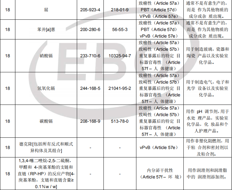 2018年01月15日,欧洲化学品管理局(ECHA)发布第十八批SVHC清单(7项),共计181项(如下图)。同时对已在清单中的双酚A进行了更新。