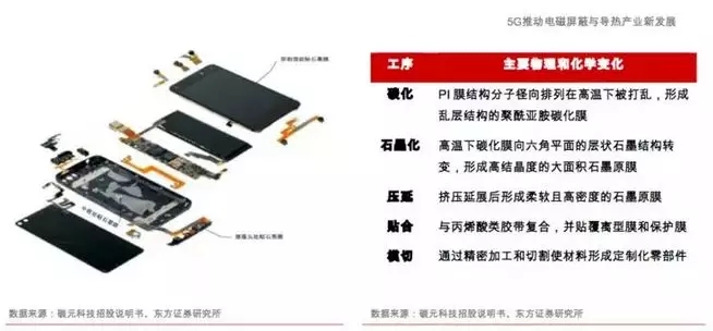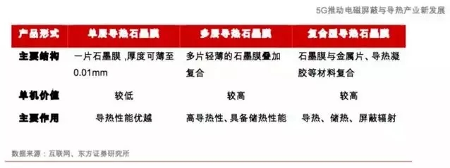 从产品形式角度来看,高导热石墨膜主要分为单层高导热膜、复合型高导热膜和多层高导热膜等多种类型。其中,单层高导热膜应用范围最广,复合型和多层高导热膜是在单层高导热膜基础上为满足客户更多的设计功能和需要与铜箔或者多片石墨膜复合而成。其中,单层高导热膜主要强调其优越的导热系数;多层高导热膜在具有高导热性能的同时还有一定的储热性能;复合型高导热膜兼具导热和储热性能,同时具有一定屏蔽辐射作用。5G时代的智能终端产品伴随更高的功耗和散热需求,同时兼具零部件创新升级大势,因此复合型和多层导热石墨膜有望迎来更广泛的应用。