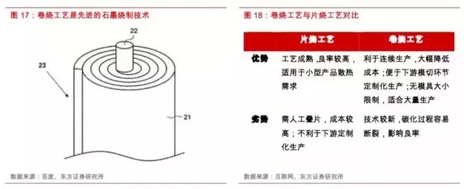 从生产工艺角度来看,导热石墨膜主要在基材处理的基础上,通过高温碳化、石墨化等环节加工而成,而高温烧制的工艺可分为片状烧制和卷式烧制技术。片烧石墨是将聚酰亚胺膜(PI膜)裁剪好后以间隔叠片的方式放入模具中,对其施压、碳化并石墨化的过程。而卷烧石墨是近年来的新兴技术,将PI膜卷绕于卷筒上,进行碳化热处理,再进行石墨化热处理,以形成卷筒状石墨膜的过程。相比于片烧工艺,卷烧石墨技术有着节省人工叠片流程的优点,且利于后续工艺的连续生产性,能大幅降低成本,同时成功的卷烧流程能使石墨膜具有良好的机械强度,没有模具大小的限制,因此十分适用于5G时代显著增长的散热需求,特别在大型设备(如基站)中具备广泛应用前景。