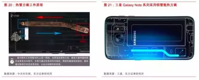 同时,随着5G时代的临近,各智能手机厂商均在近期发布的旗舰机型中加大散热方案的创新和应用力度,为后续的规模导入做准备。其中,热管散热技术作为PC机领域的主流散热方案,已逐渐被搭载于智能手机中。热管方案又常被人们以“水冷散热技术”所认知,在手机中搭载铜制散热管,并在导管中加入特质的导热液体(水或乙二醇),吸收手机核心元件发出的热量后,导热液体逐渐汽化并在导管内流动,当流动到低温处时将释放热能凝结成液态,完成手机热量的快速转移,并通过与热管连接的固定散热材料将热量散出。
