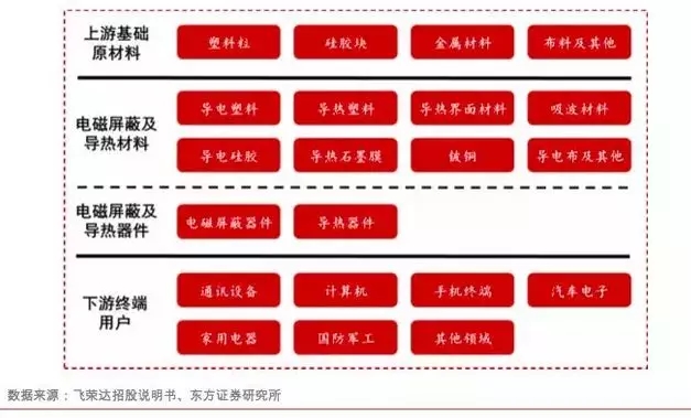 电磁屏蔽和导热材料及器件处于产业链的中游,上游是塑料粒、硅胶块、金属材料和布料及其他等基础原材料,下游是通讯设备、计算机、手机终端、汽车电子、家用电器和国防军工等终端用户。其中,电磁屏蔽和导热器件是在电磁屏蔽和导热材料的基础上进行二次加工处理。
