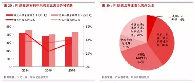 其中导热石墨膜的主要原材料为聚酰亚胺(PI膜),是一种高性能的绝缘材料,具有较高的技术壁垒,全球范围内高性能的聚酰亚胺生产厂商较少,主要集中于美国和日韩,因此PI膜价格波动对导热石墨膜产品毛利率具有较大影响。自2016年以来,随着下游需求快速提升,PI膜基本处于供不应求阶段,采购价格有所反弹,未来随着供给端新增产能陆续开出,供需关系有望保持稳定。