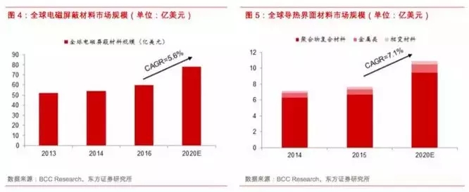 近年来随着软硬件技术不断升级,消费电子产品创新及通信设备升级推动电磁屏蔽和导热材料市场稳步增长。根据BCC Research的预测,全球EMI/RFI屏蔽材料市场规模将从2016年的60亿美元提高到2021年的78亿美元,复合增长率近6%,而全球界面导热材料的市场规模将从2015年的7.6亿美元提高到2020年的11亿美元,复合增长率超7%。