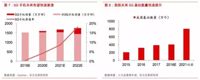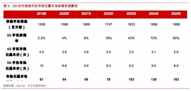 以导热石墨为例,5G手机有望在更多关键零部件部位采用定制化导热石墨方案,同时复合型和多层高导热膜由于具备更优的散热效果而有望被更多采用,从而带来导热石墨单机价值的显著提升。假设未来5G手机中的导热石墨单价是4G手机中的2.5倍,伴随5G手机渗透率的提升,应用于智能手机的导热石墨市场规模将有望实现翻倍以上增长。