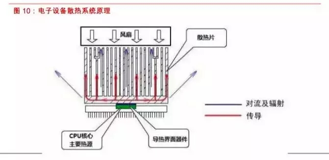 在热力学中,散热就是热量传递,方式主要有热传导,热对流和热辐射等三种。根据热的传递方式,电子设备散热系统可以由风扇、散热片(如石墨片、金属散热片等)和导热界面器件组成。导热界面器件功能是填充发热元件与散热元件之间的空气间隙,提高导热效率,通常用于通讯设备、计算机和外设、功率变换设备、存储模块、芯片级封装等领域,而散热片通过导热界面器件与电子元件表面接触,利用其在水平方向上的导热性,迅速降低电子产品工作时发热元件所在位置的的温度,使得电子产品温度趋于均匀化,扩大散热表面积以达到降低整个电子产品的温度,提高电子产品的工作稳定性及使用寿命。