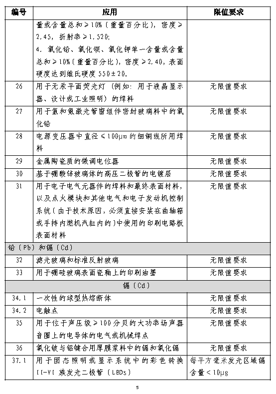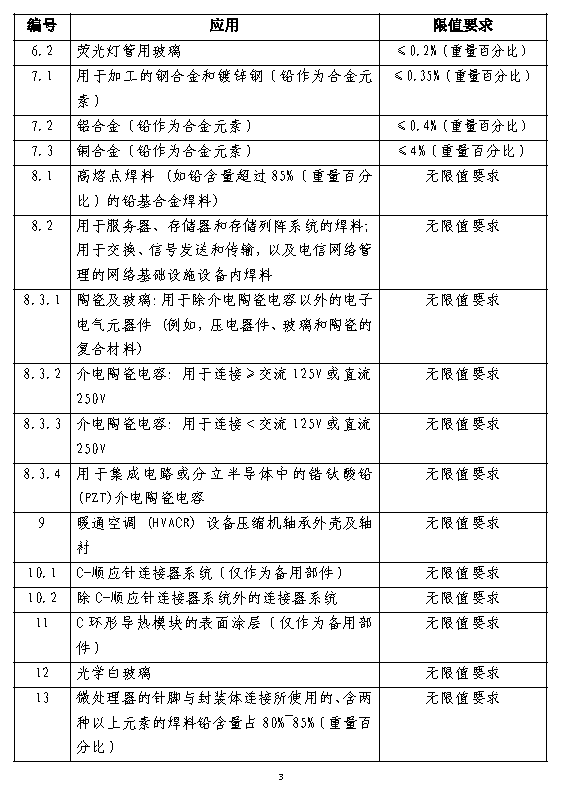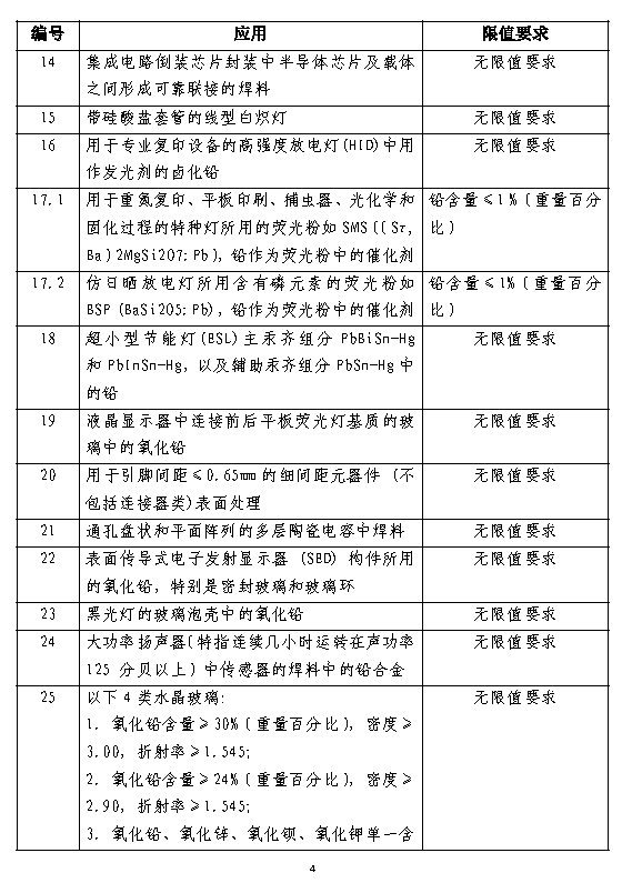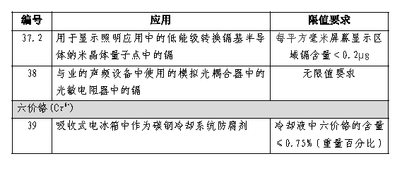 除此达标管理目录外,《达标管理目录限用物质应用例外清单》对39种用途的特定产品中汞、铅、镉、六价铬四种有害物质提出了豁免情况,豁免情况分为三类: