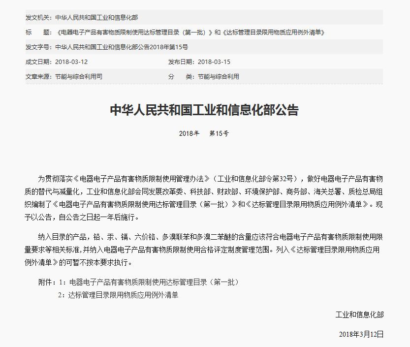2018年3月15日中华人民共和国工业和信息化部发布了《电器电子产品有害物质限制使用达标管理目录(第一批)》和《达标管理目录限用物质应用例外清单》,并将于2019年3月15日正式施行。