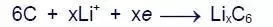 锂离子嵌入石墨层中,同时电子通过外电路到达负极,形成相对稳定的嵌锂石墨↓