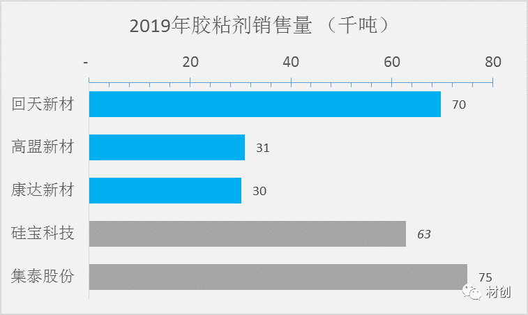 在销售量方面,回天新材在2019年销售超过7万吨,依然领先。高盟新材和康达新材均为3万吨。硅宝科技和集泰股份没有单独公布胶粘剂的体量,而与其他化学品一并合计披露。