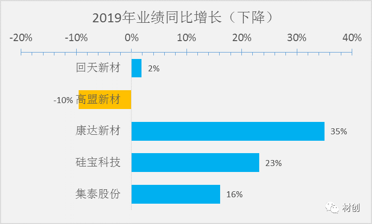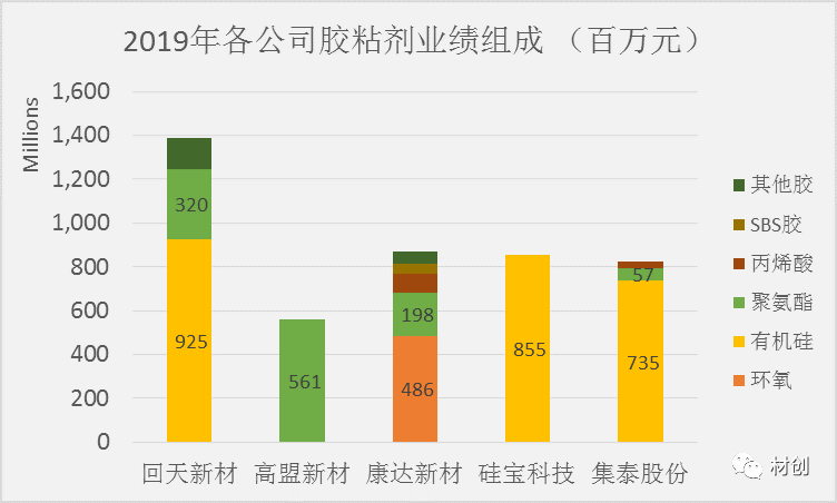 而这5家公司中,康达新材、硅宝科技和集泰股份在2019年整体化工材料行业不景气的背景下,销售额增长仍超过15%,发展迅速。回天新材的业绩增长为2%,表现正常。只有聚氨酯胶单一胶粘剂业务的高盟新材业绩下降10%,与聚氨酯行业整体下降的背景类似。