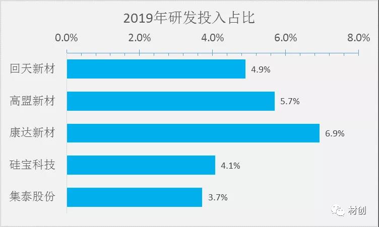 而在研发投入方面,5家中国上市公司均大幅度高于欧美公司和化工行业平均水平。康达新材研发投入高达6.9%,为5家公司中最高,最低的集泰也高达3.7%。这些数据放在所有材料公司中都位居前列。(数据对比:材料企业在研发的投入多吗?)