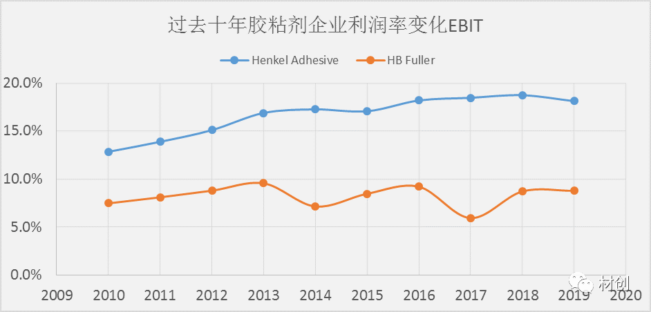 在过去的10年,汉高和富乐的胶粘剂业务都有着良好的发展。汉高在胶粘剂的销售额从2010年的82亿美元增长到2019年的106亿美元,年复合增长2.6%。EBIT利润率在过去10年也大幅度提升,从2010年12.8%增长到2019年的18.1%。富乐在过去10年销售额从12亿美元增长到2018年超过30亿美元,不过在2019年有所回落,年复合增长接近10%,发展迅速。但是,在利润率方面仍然大幅度落后第一名汉高,一直在5%至10%之间徘徊。