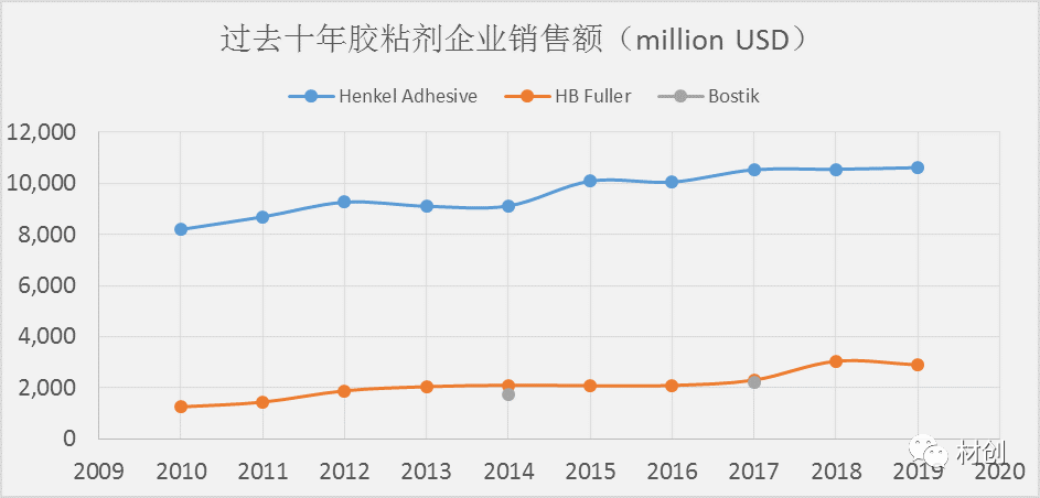 图2: 三家欧美公司过去十年胶粘剂销售额