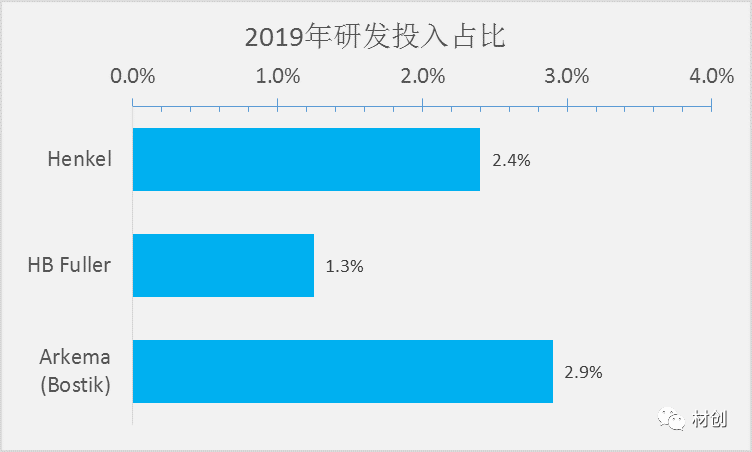 令人意外的是胶粘剂行业三大欧美公司的研发投入并不高。汉高2019年的研发投入为销售额的2.4%,富乐仅为1.3%,在化工材料公司中都属于中等偏下的位置(延伸阅读:材料企业在研发的投入多吗?)波士胶在2017年披露的数据其研发占比从2014年的2%上升到2.7%[1],阿科玛公司整体在2019年的研发占比为2.9%。