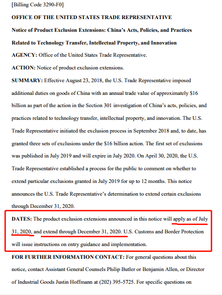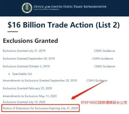 7月27日,美贸易代表办公室(USTR)又公布了针对160亿美元中国产品加征关税(List 2)于2019年7月31日第7批排除清单加征有效期延长公告。