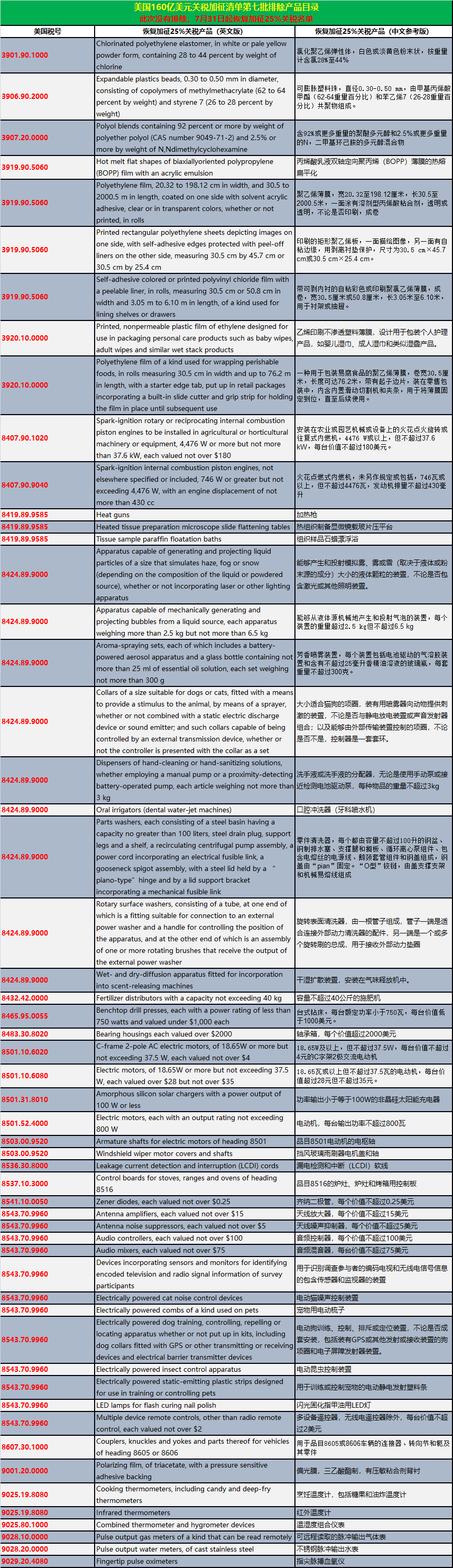 此次没有在排除名单内商品共涉及28个税号下55个品项的商品,恢复加征25%关税,名单如下: